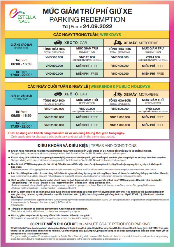 Mức giảm trừ phí gửi xe tại TTTM Estella Place